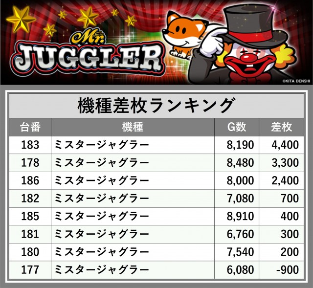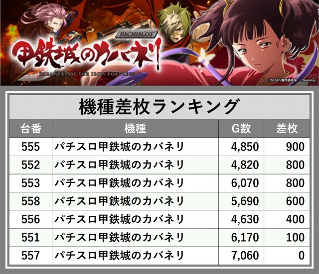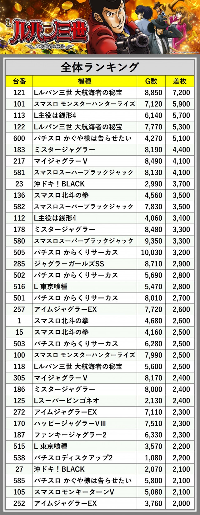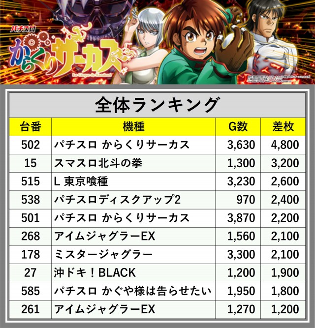 ※差枚数順に掲載しています