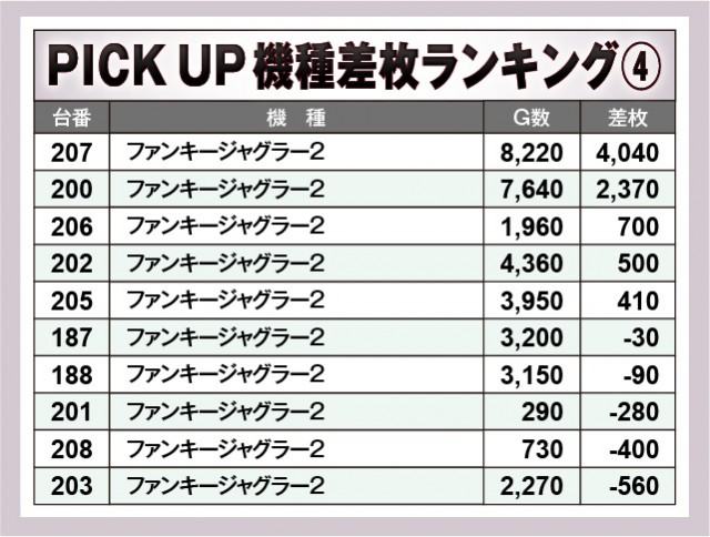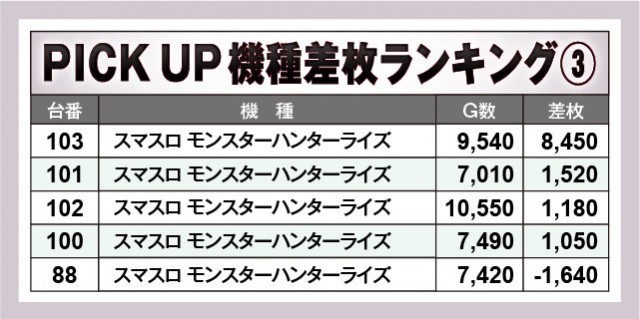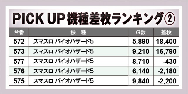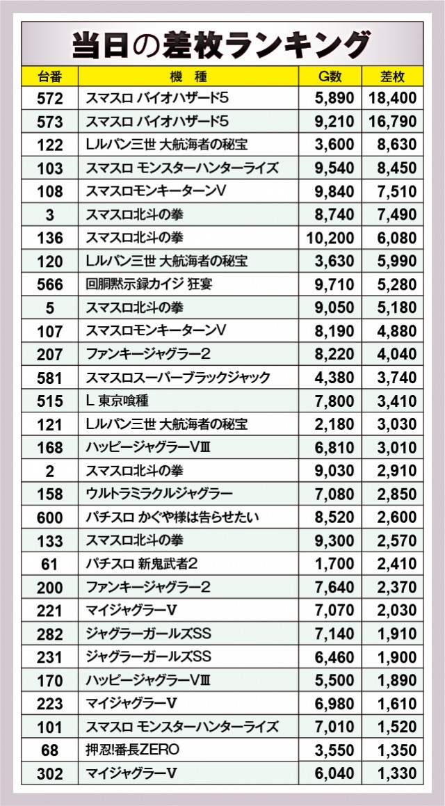『スマスロ バイオハザード5』にて18,000枚OVERと16,000枚OVERが生まれており、導入から間もないながら、大きな熱気で活躍していたのが鮮烈であるばかり。他にも『スマスロ北斗の拳』や『スマスロ モンスターハンターライズ』も大きな熱気を放っており、先輩機種として気を吐いていたのも見逃せない。そして『ファンキージャグラー2』も回転数と差枚数が比例する展開を披露しており、存在感を放っていた。