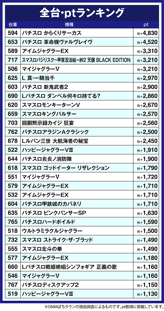 「L 真・一騎当千」や「パチスロ 新鬼武者2」など、多くの機種に約+2,500ptを超えた台があった。