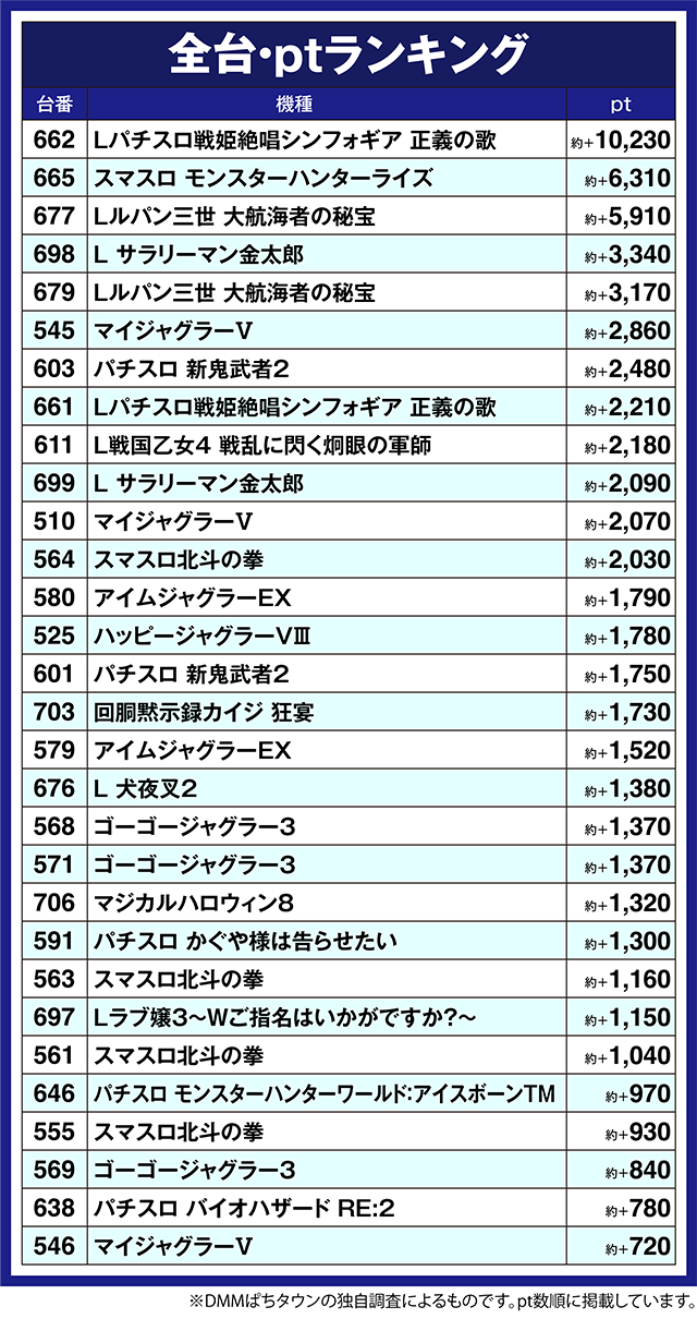 約+2,000ptを超えた台は、「マイジャグラーⅤ」や「パチスロ 新鬼武者2」など幅広い機種にあった。
