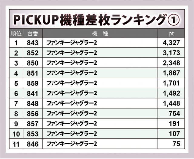『ファンジャグ』20台の勝率は5割超、843番台が+4千3百超とシリーズ一番の数値を残した上に、+3千1百超・+2千3百超が1台ずつ&+1千4百超が4台と、堅実な勝負が挑める環境だった。