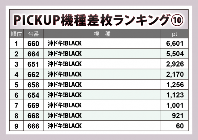 『沖ドキ!BLACK』20台では半数弱のプラス率で、+6千6百超・+5千5百超がツートップとなったのに加えて+2千超が2台・+1千超が3台と、上の機種に対抗していた。