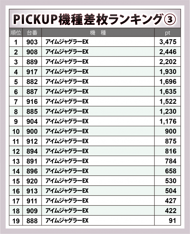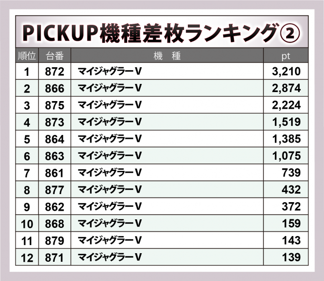『マイジャグ』20台ではプラス台の多さで『ファンジャグ』を上回った。また872番台が+3千2百超、さらに+2千超が2台・+1千超が3台と、勝機が確実に窺えた。