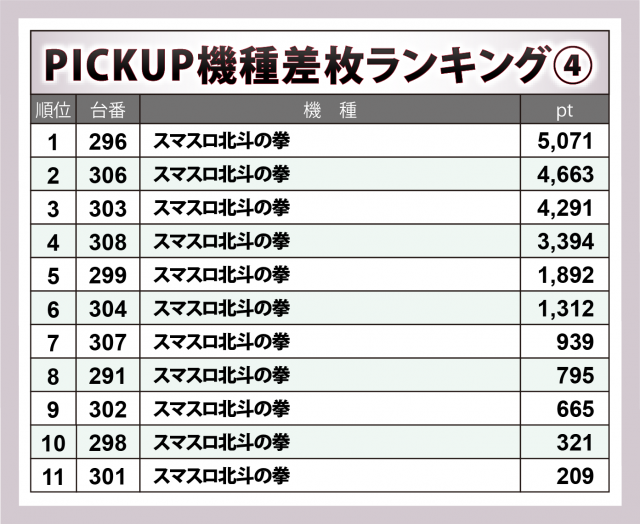 『スマスロ北斗』20台も半数強の台が勝利を収め、+5千1百弱の296番台がシマの頂点に輝いた上に、+4千超×2・+3千4百弱×1・+1千超が2台と、波の荒いスマスロの中では手堅さが光っていた。