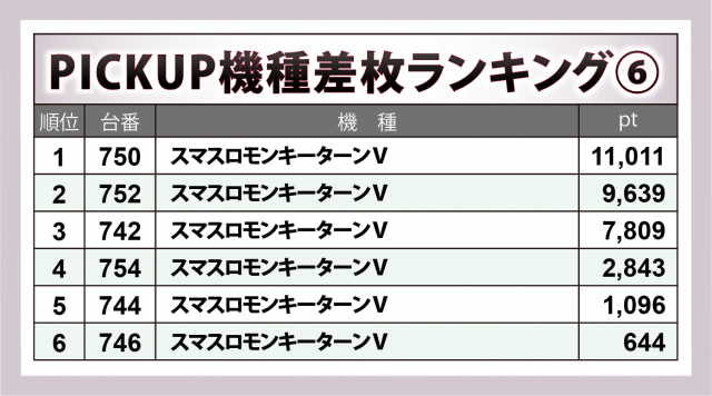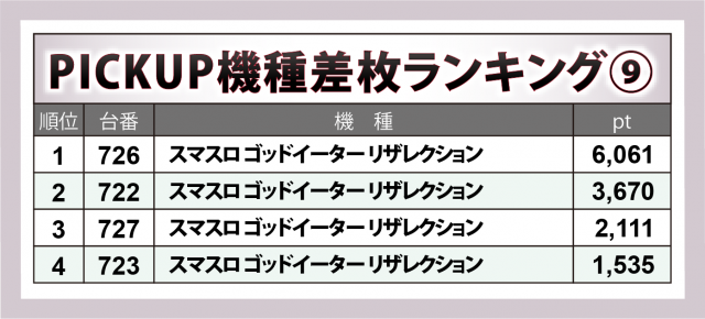 その他の機種では、『L ゴジラ対エヴァンゲリオン』980番台が+1万8千超、『スマスロ シャーマンキング』975番台が+1万3千4百超、『スマスロ ゲゲゲの鬼太郎 覚醒』968番台が+1万7百超と、設置数の少ない機種がホームラン級の出玉を叩き出した。なお『ゴジエヴァ』では978番台が+6千8百弱となったことにも触れておこう。