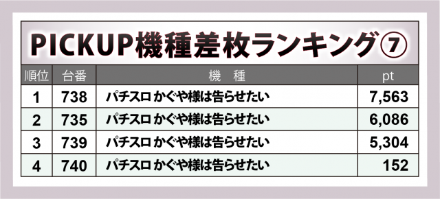 『パチスロ かぐや様は告らせたい』6台ではプラス台割合が高く、5桁プラスこそカウントできなかったが、+7千6百弱・+6千1百弱・+5千3百超が1台ずつと、大量獲得への道が拓けていた。