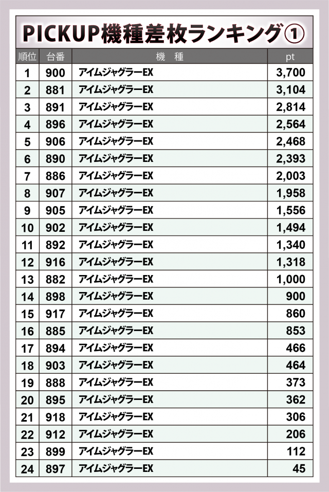 設置40台の『アイムジャグ』は半数以上がプラスを収め、+3千超×2・+2千超×5・+1千超×6と、安定度の高さが窺えた。