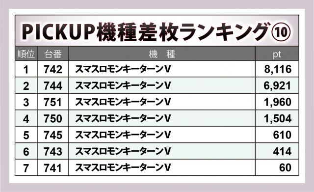 『スマスロモンキーターンⅤ』14台ではちょうど半分の7台が勝利。742番台の+8千1百超を筆頭に+6千9百超が1台・+1千5百超が2台と、盛り上がりでは他機種に引けを取らなかった。