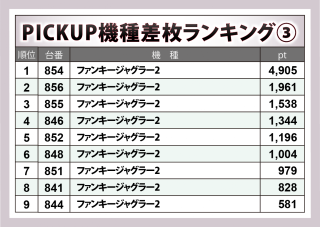 『ファンジャグ』20台では僅かに勝率5割には及ばなかったものの、854番台が+4千9百超とボーナスタイプ最多pt数を残した他にも+1千超が5台と、しっかりと勝負できる環境だったようだ。