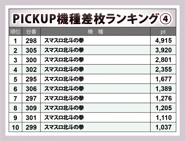 『スマスロ北斗』20台はピッタリ半分の台が勝利、その10台全てが4桁プラスを成し遂げ、上位陣では+4千9百超・+3千9百超・+2千8百超・+2千4百弱が1台ずつと、確かな成果が得られた。