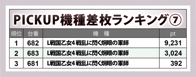 『L戦国乙女4 戦乱に閃く炯眼の軍師』4台は3台がプラスと高勝率で、+9千2百超の682番台がひときわ目立っていた。