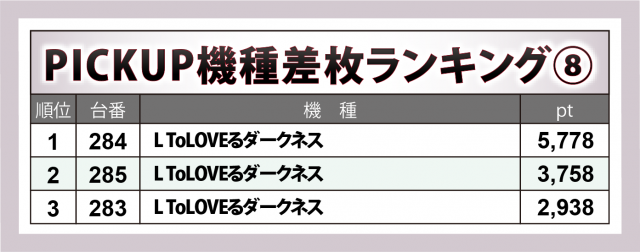 『L ToLOVEるダークネス』5台では表の3台が4桁のプラス。しかも+5千8百弱・+3千8百弱・+2千9百超と、重量級の出玉がズラリ。