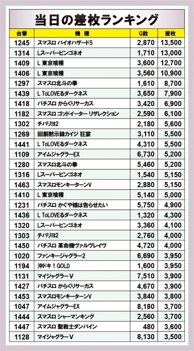 ※差枚数順に掲載しています。