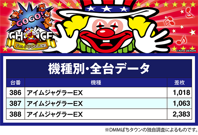 「マイジャグラーⅤ」も設置されている3台がプラスとなり、378番台は3,865pt。