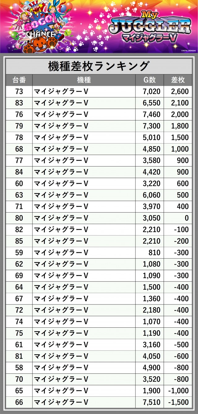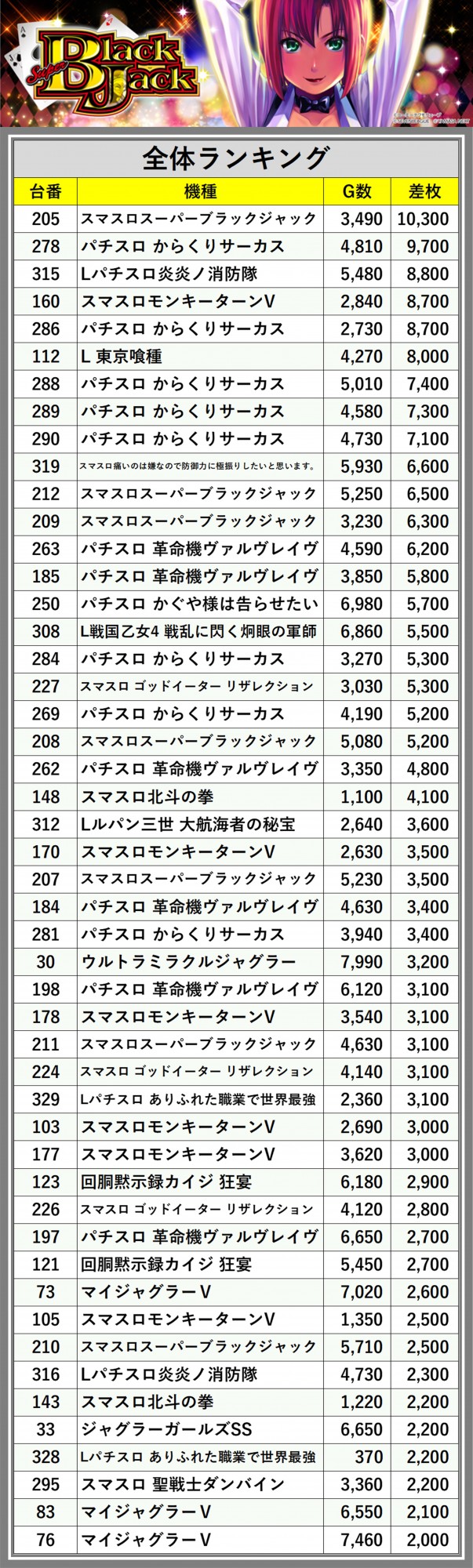 厳選された取材対象機種をはじめ、その他スロット全体から好記録が飛び出した!プレイヤーが楽しんだ1日を下記データにて振り返ってみて欲しい。