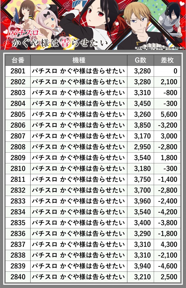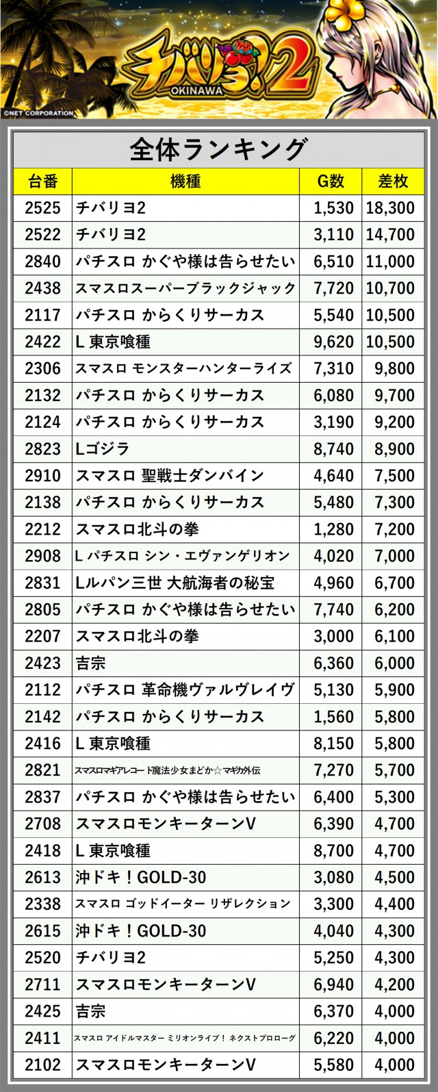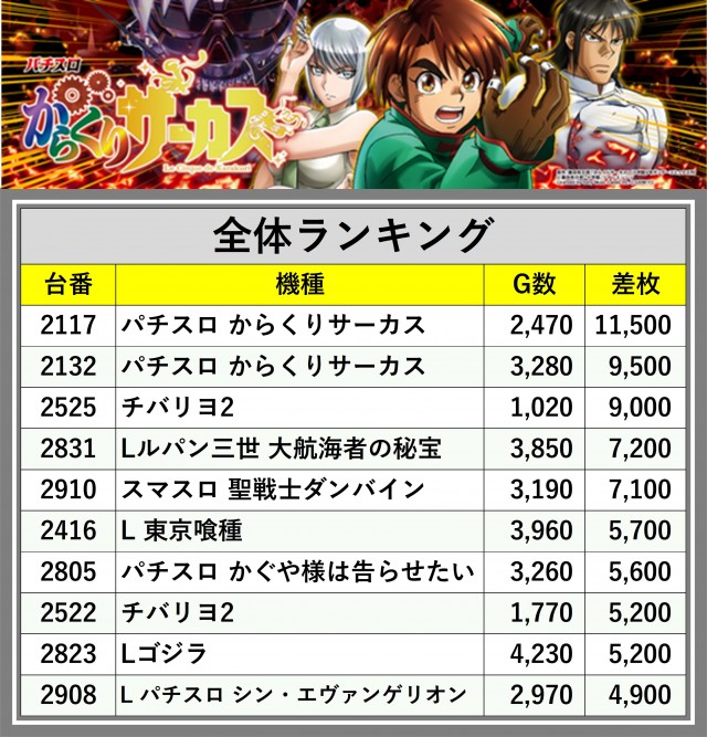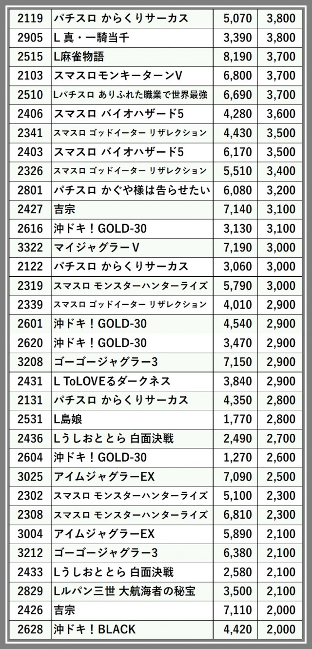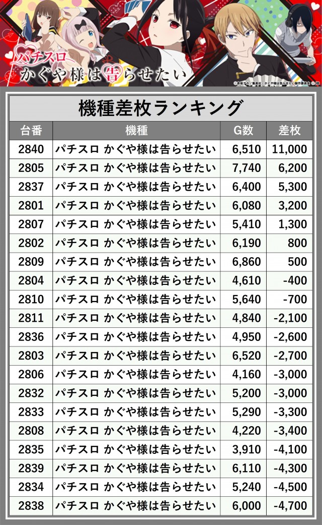 ※差枚数順に掲載しています