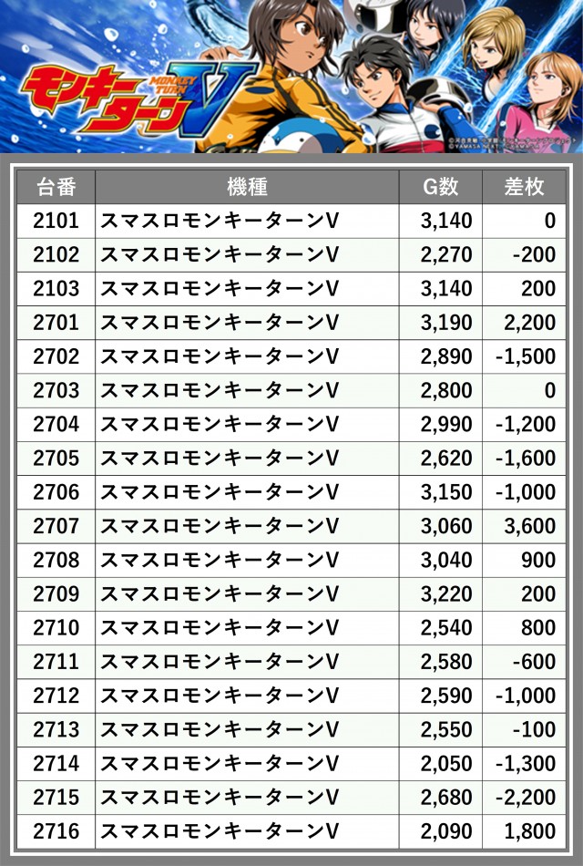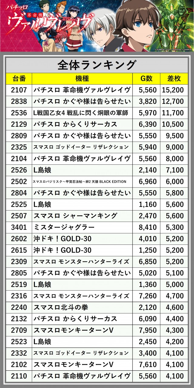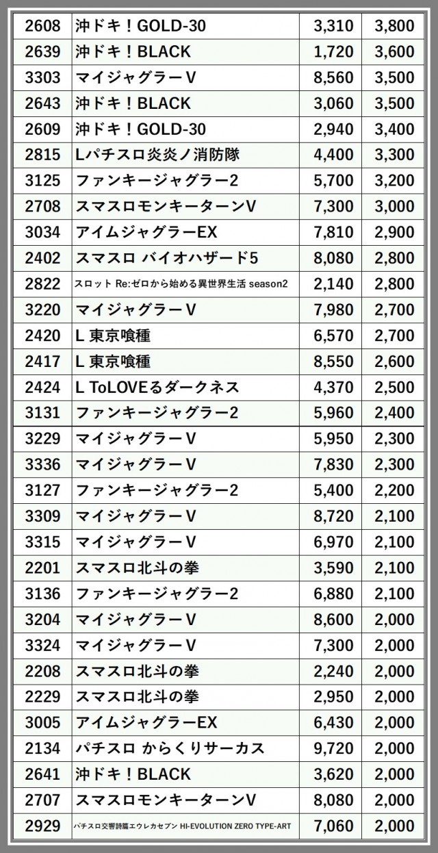 厳選された取材対象機種をはじめ、その他スロット全体から好記録が飛び出した!プレイヤーが楽しんだ1日を下記データにて振り返ってみて欲しい。