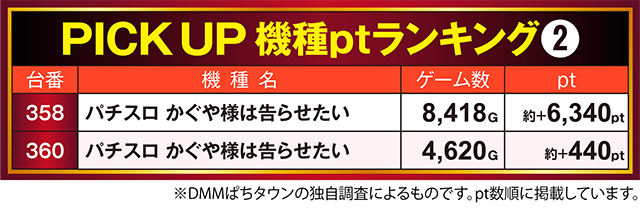 「パチスロ かぐや様は告らせたい」では、358番台が約+6,300ptオーバー。