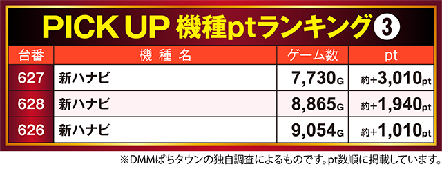 「新ハナビ」は4台中3台が約+1,000ptを超え、627番台が約+3,010ptを記録しました♪