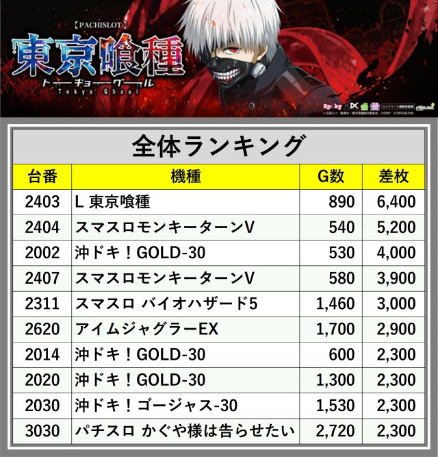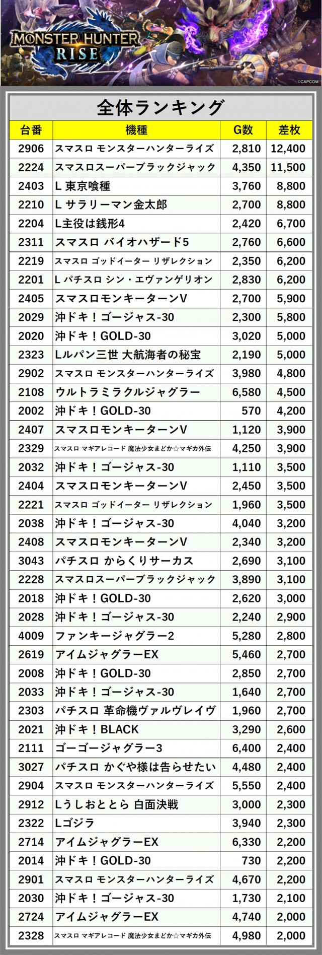 厳選された取材対象機種をはじめ、その他スロット全体から好記録が飛び出した!プレイヤーが楽しんだ1日を下記データにて振り返ってみて欲しい。