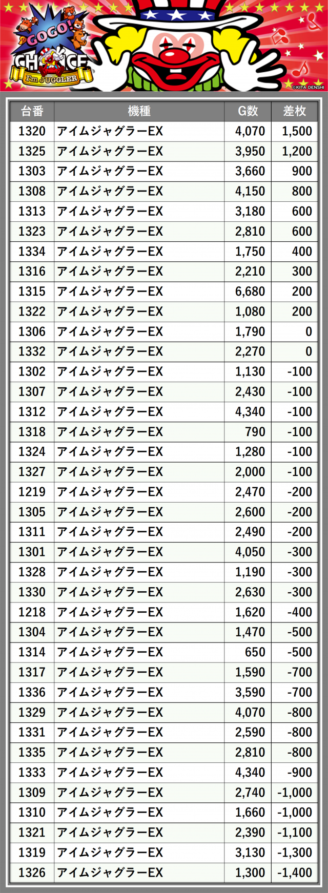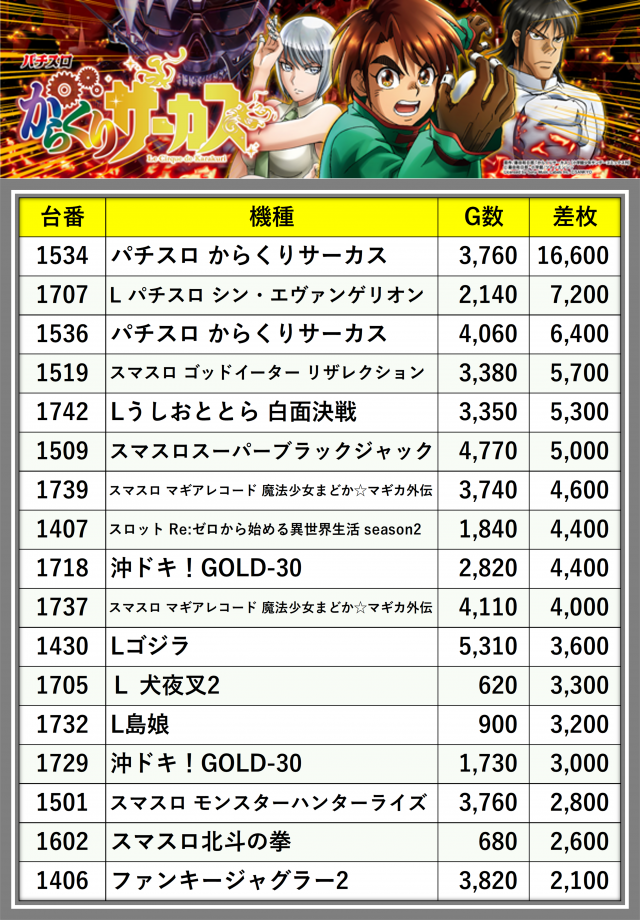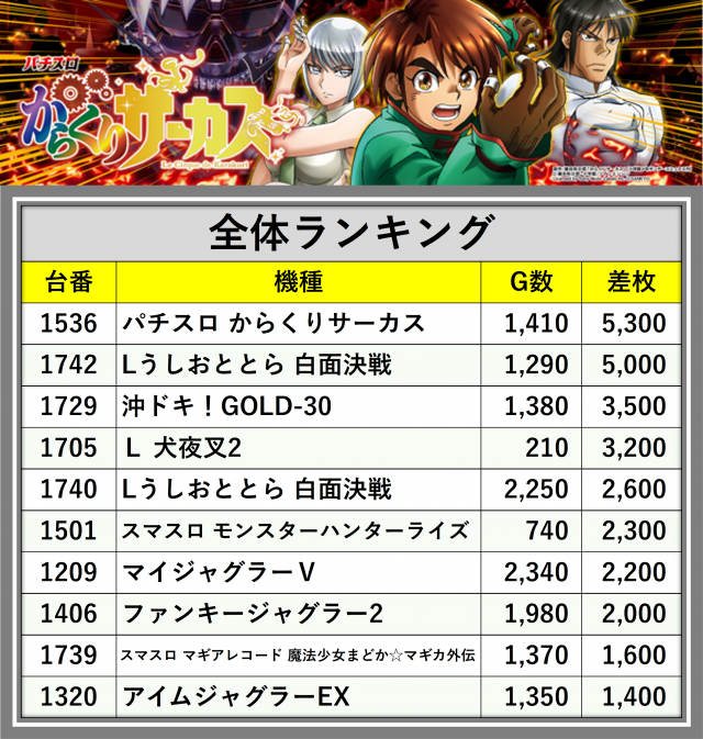厳選された取材対象機種をはじめ、その他スロット全体から好記録が飛び出した!プレイヤーが楽しんだ1日を下記データにて振り返ってみて欲しい。