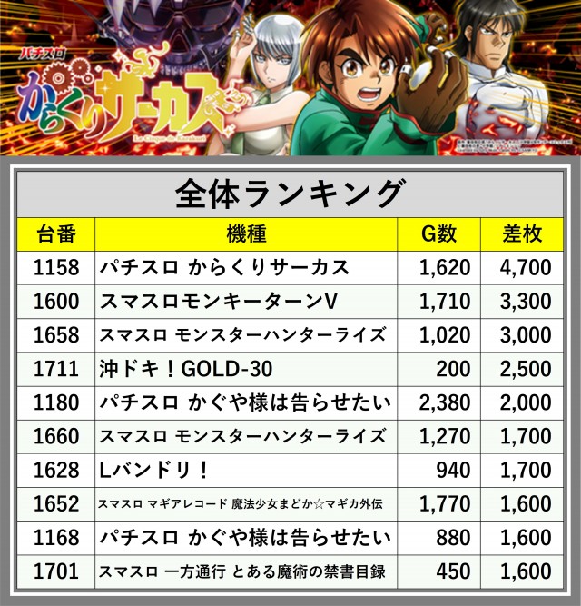 厳選された取材対象機種をはじめ、その他スロット全体から好記録が飛び出した!プレイヤーが楽しんだ1日を下記データにて振り返ってみて欲しい。