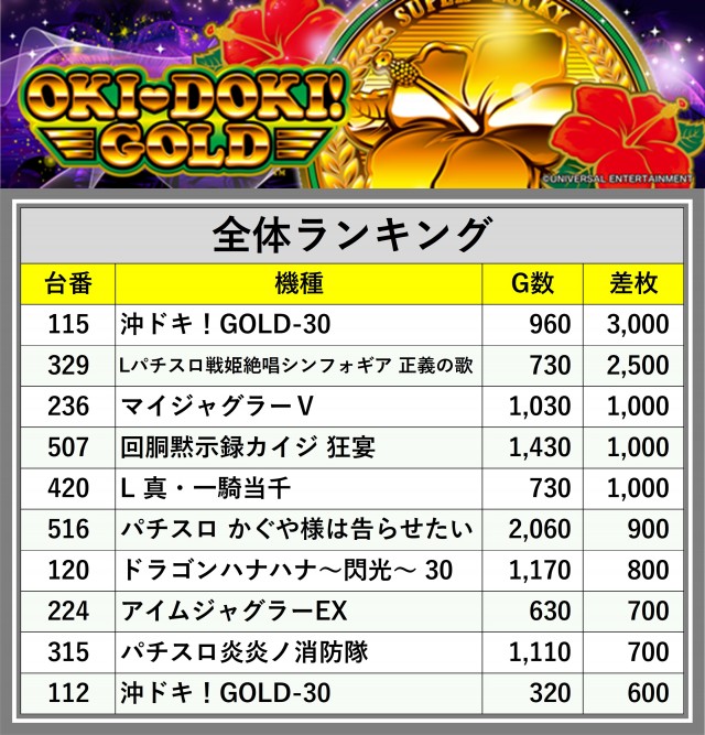 厳選された取材対象機種をはじめ、その他スロット全体から好記録が飛び出した!プレイヤーが楽しんだ1日を下記データにて振り返ってみて欲しい。
