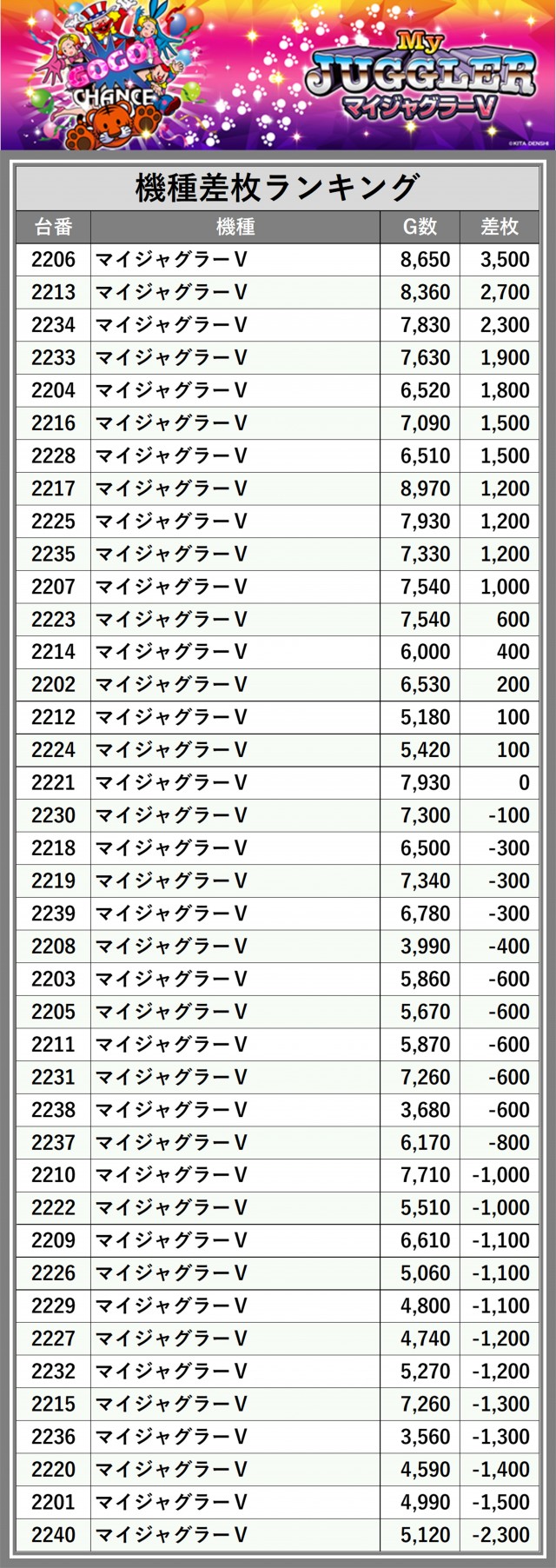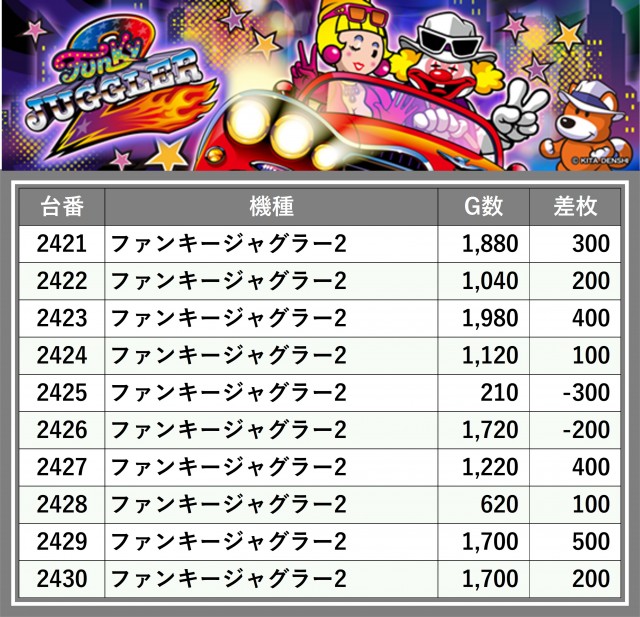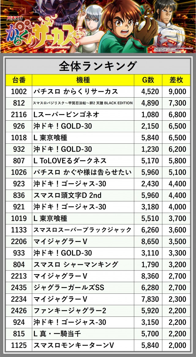 厳選された取材対象機種をはじめ、その他スロット全体から好記録が飛び出した!プレイヤーが楽しんだ1日を下記データにて振り返ってみて欲しい。