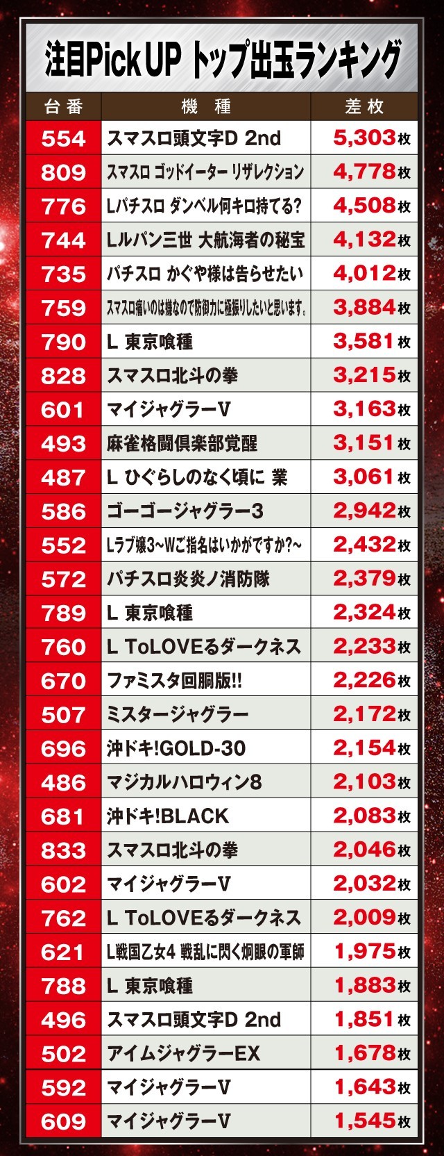 また、その他の機種ではジャグラーシリーズも大奮闘。『マイジャグラーⅤ』の+3,163枚をはじめ『ゴーゴージャグラー3』や『ミスタージャグラー』、さらには『マイジャグラーⅤ』と、複数の機種がランキングに名を連ねている。