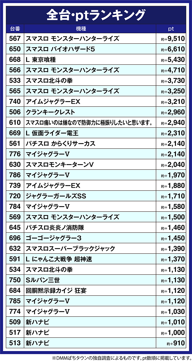 ボーナスが軸となる機種も盛り上がりが大きく、「アイムジャグラーEX」の740番台や「クランキークレスト」の506番台などが約+2,900pt以上となった。