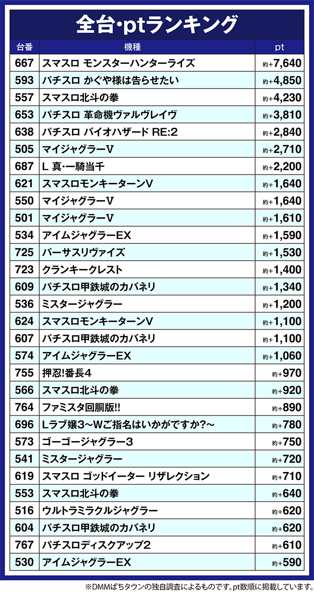 ほかにも、「パチスロ 革命機ヴァルヴレイヴ」や「パチスロ バイオハザード RE:2」などに約+2,000ptを超えた台があった。