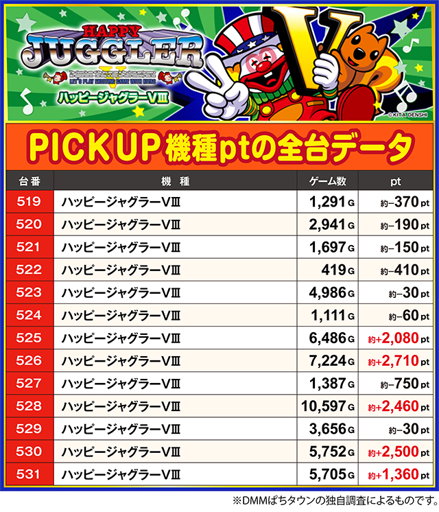 「PaPaOne」の「ハッピージャグラーVⅢ」は、7台中5台がプラス。
