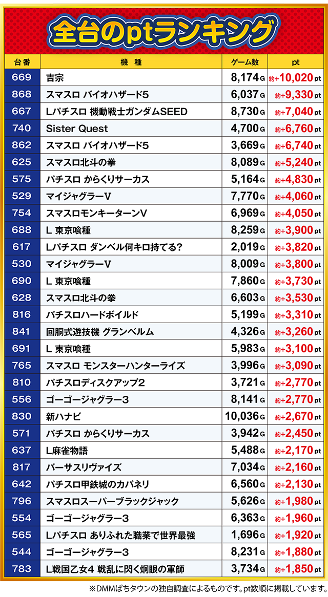約+1,600ptを超えた608番台など、4台がプラスとなった。