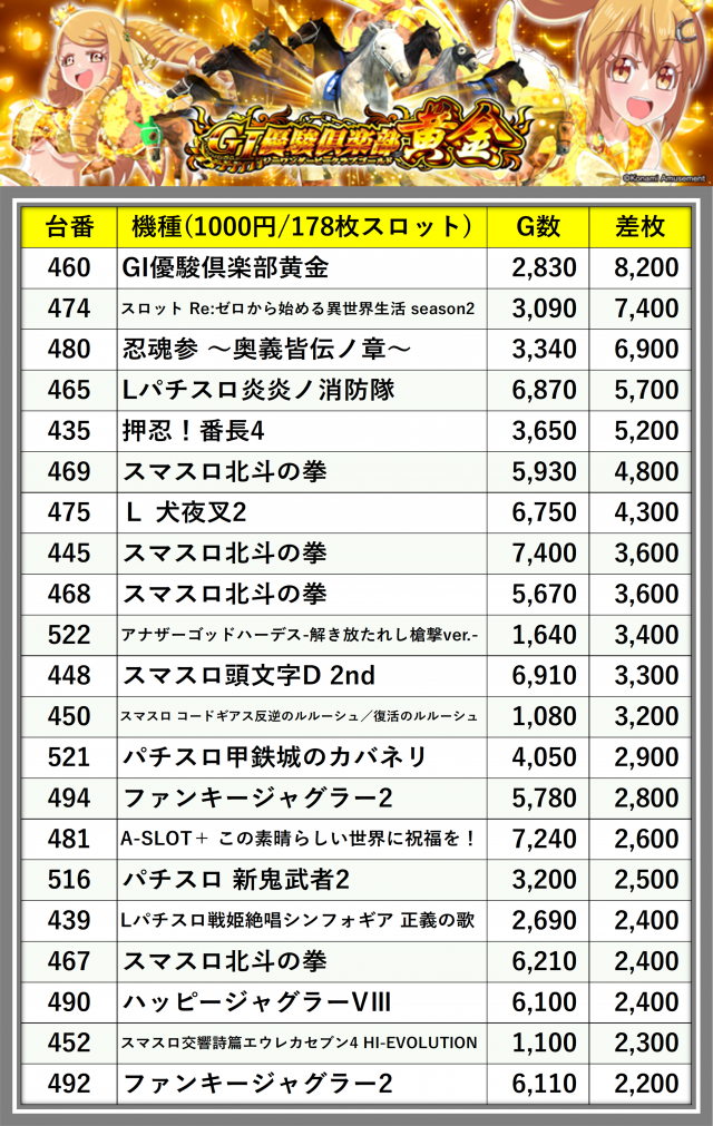 厳選された取材対象機種をはじめ、その他スロット全体から好記録が飛び出した!プレイヤーが楽しんだ1日を下記データにて振り返ってみて欲しい。