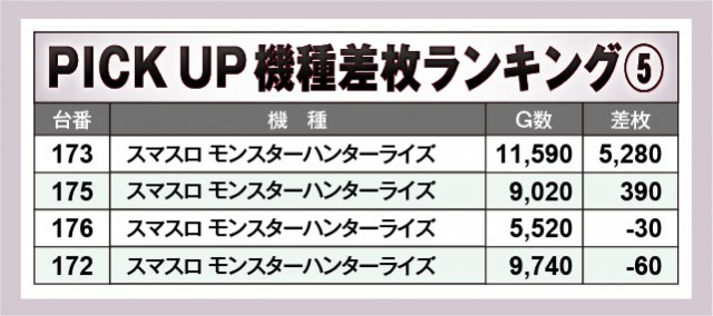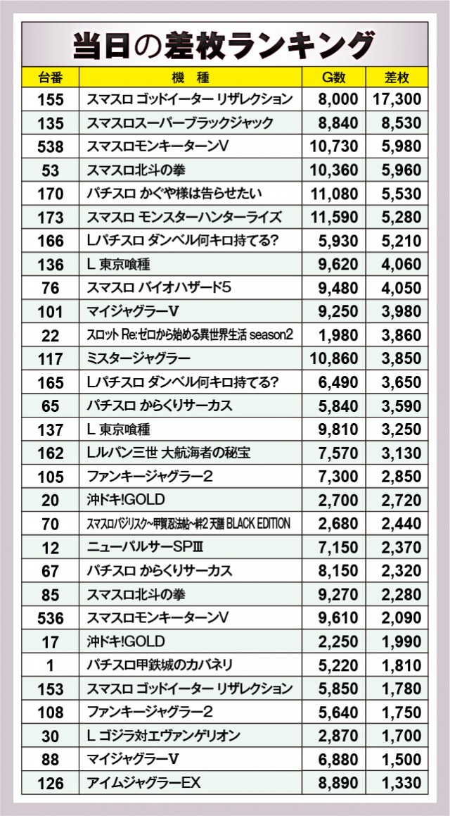 『スマスロ ゴッドイーター リザレクション』の万枚OVERに目を奪われるが、いずれもまとまった出玉を確保しているのが鮮烈だ。その中で『Lパチスロ ダンベル何キロ持てる?』『L 東京喰種』『ミスタージャグラー』は全台プラス差枚数を達成しており、大きな存在感を放っていたと言えよう。『スマスロ モンスターハンターライズ』は大きなマイナスが見られず、こちらも全台プラスの可能性があっただけに、優秀機種には大きな可能性が秘められていたのは間違いないはずだ。