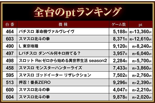 ほかにも、「Lパチスロ ダンベル何キロ持てる?」や「スロット Re:ゼロから始める異世界生活 season2」などで約+5,700pt以上となった台を確認した。