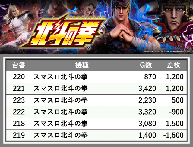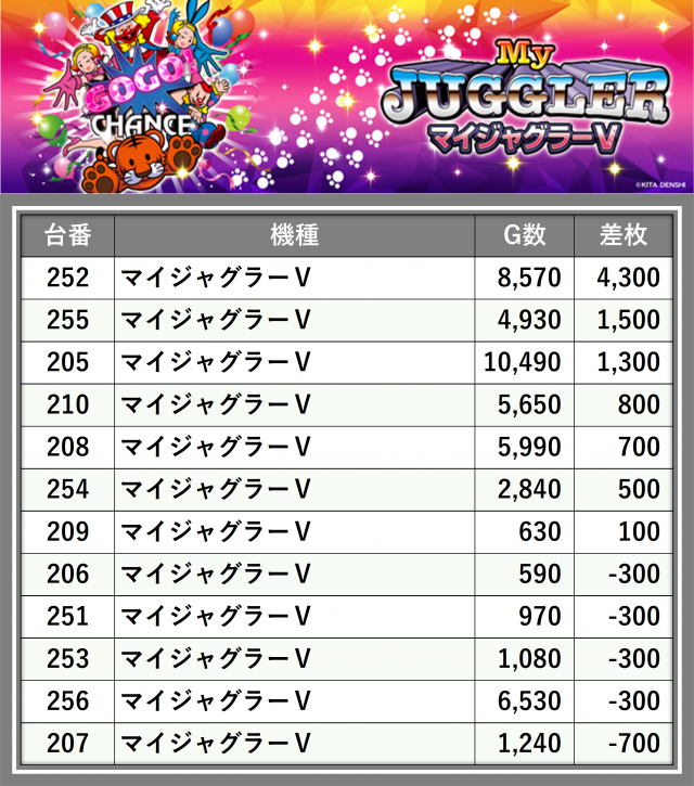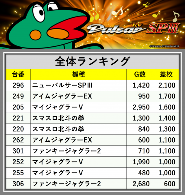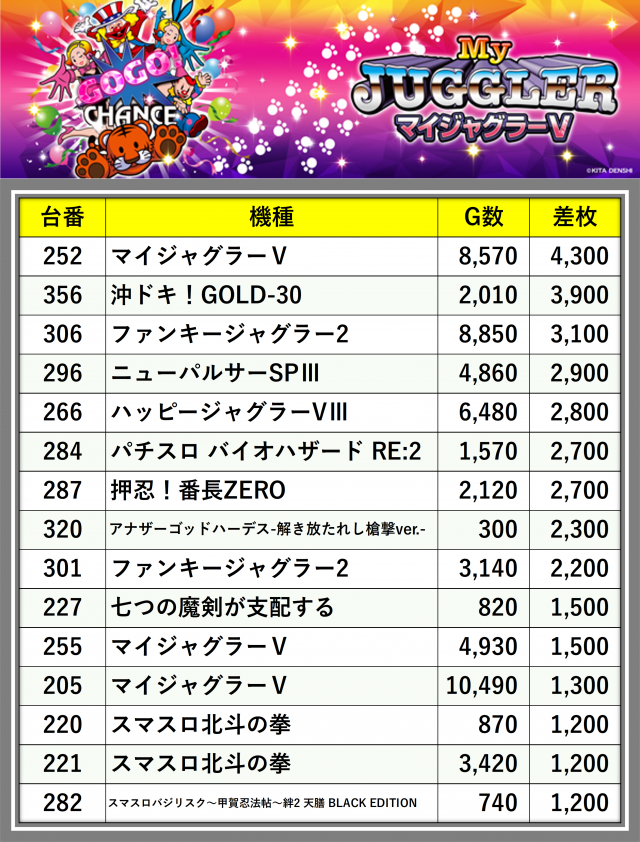 厳選された取材対象機種をはじめ、その他スロット全体から好記録が飛び出した!プレイヤーが楽しんだ1日を下記データにて振り返ってみて欲しい。