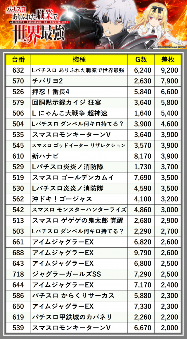厳選された取材対象機種をはじめ、その他スロット全体から好記録が飛び出した!プレイヤーが楽しんだ1日を下記データにて振り返ってみて欲しい。