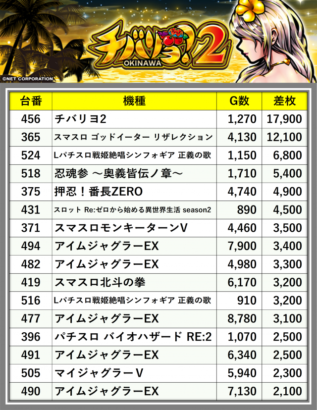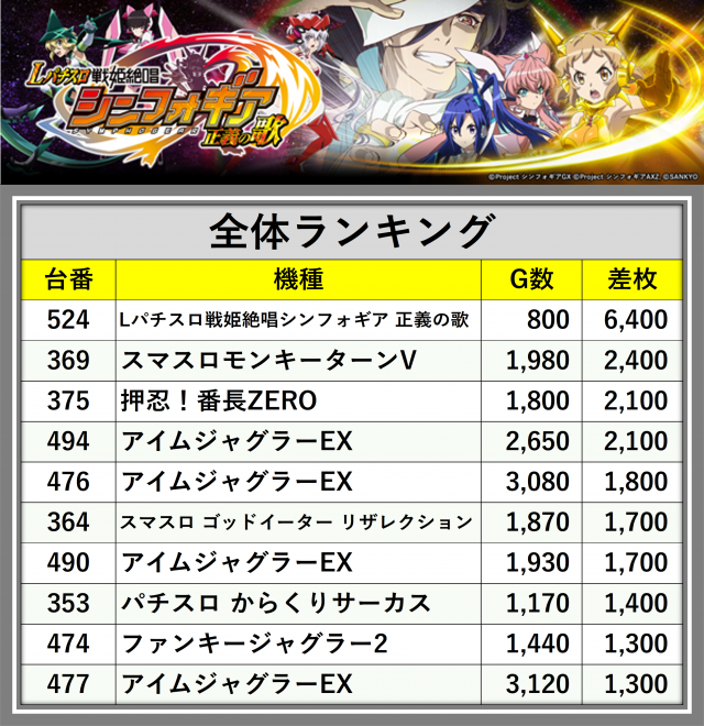 ※差枚数順に掲載しています