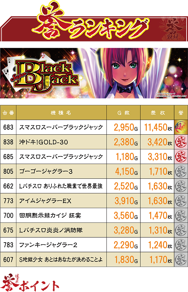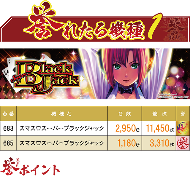 過去4回の誉取材において、10,000枚オーバー記録を生み出すことはできなかったが、今回ついに『スマスロスーパーブラックジャック』から10,000枚オーバー台が誕生!2位の記録に3倍以上の大差をつけてのTOP記録となった。また同機は3位にもランクイン!今後も『スマスロスーパーブラックジャック』にはチャンスが多め…!?