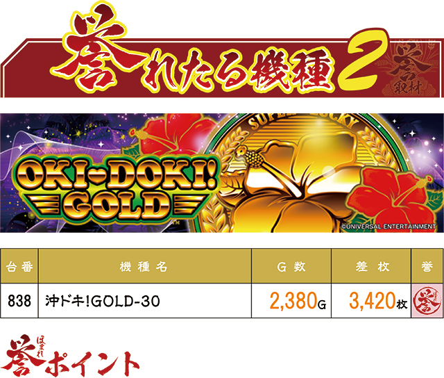 誉ランキング2位入賞の『沖ドキ!GOLD-30』。838番台が3,000枚を突破し、見事赤誉マークを獲得することとなった。だがしかし、総ゲーム数が少ないため、もっと回されていたら…と悔やまれる。