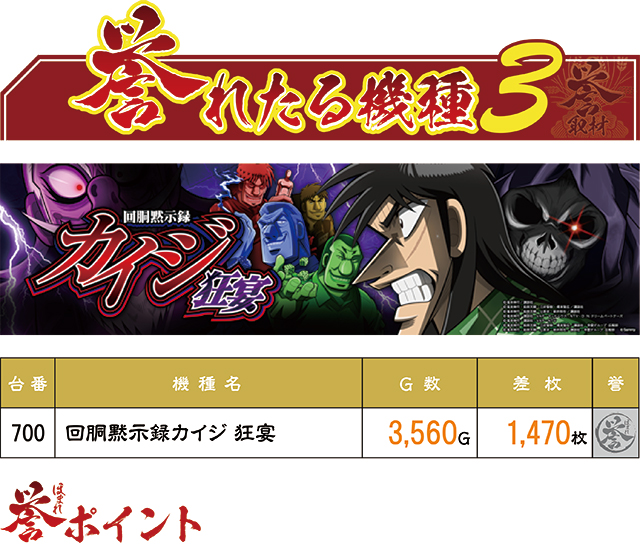 『スマスロスーパーブラックジャック』がぶっちぎりの結果を見せつけた今回。残念ながら対抗馬となる台は不在だったため、圧倒的な差枚となってしまった。この日は新台の『回胴黙示録カイジ 狂宴』が奮闘した上、オールドマシンの『S地獄少女 あとはあなたが決めることよ』もランクインするなど、新旧関係なしにチャンスが眠っていた様子。