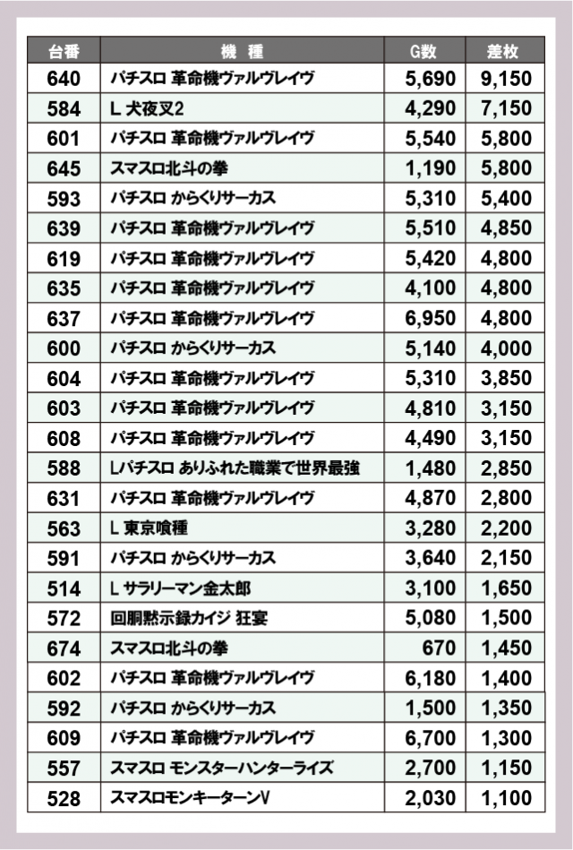 ※差枚数順に掲載しています