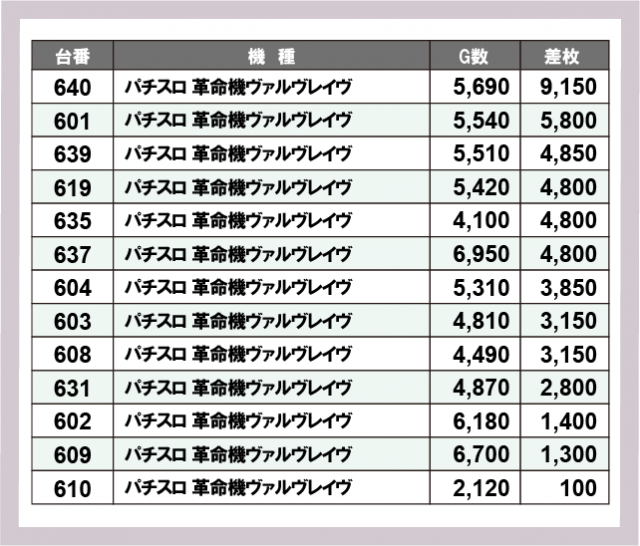 ヴァルヴレイヴ差枚ランキング