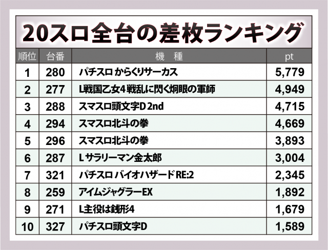 最初は全てが+1,500枚以上をマークした20スロのトップ10台に注目。