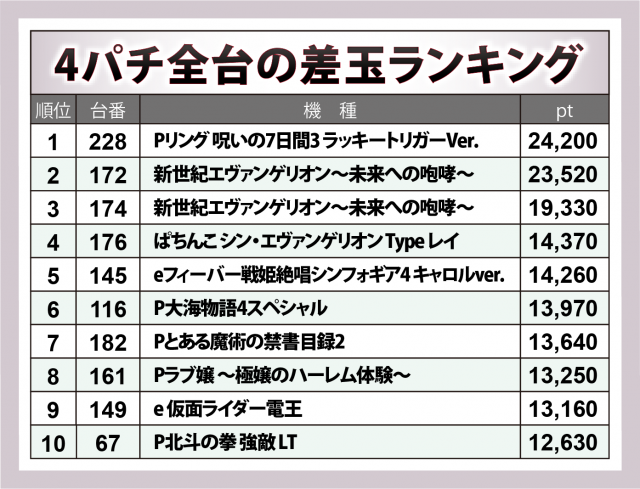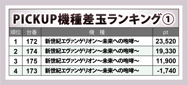 『新世紀エヴァンゲリオン~未来への咆哮~』4台では3台が勝利とプラス台割合が高く、中でも172番台が+24,000個弱の大台を残した。