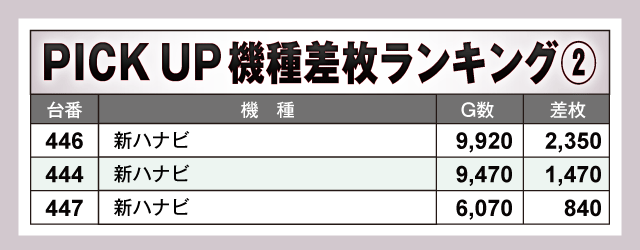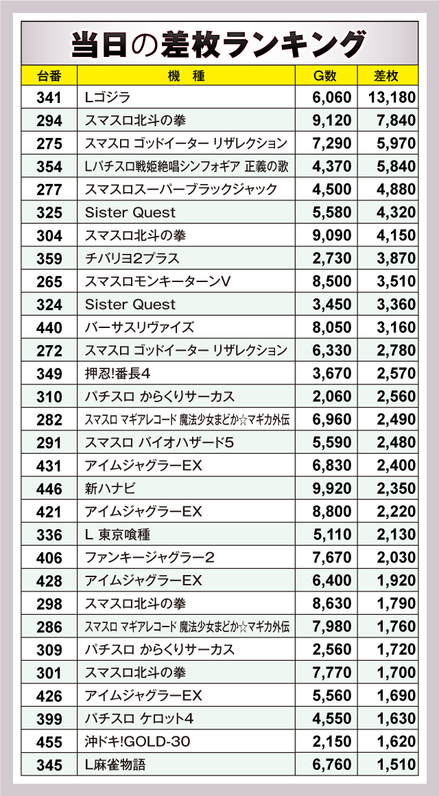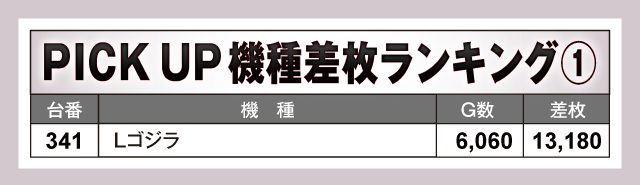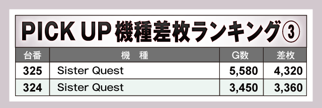 続いてPICK UP機種の状況を見ていこう。ランキングを制した『Lゴジラ』以外で特に目立っていたのが『Sister Quest』で、設置されている2台がともに+3,000枚超を記録。また、『新ハナビ』も4台中3台がプラス差枚となる見事な結果を残しており、ファンにとって充実の一日となったのは間違いないだろう。
