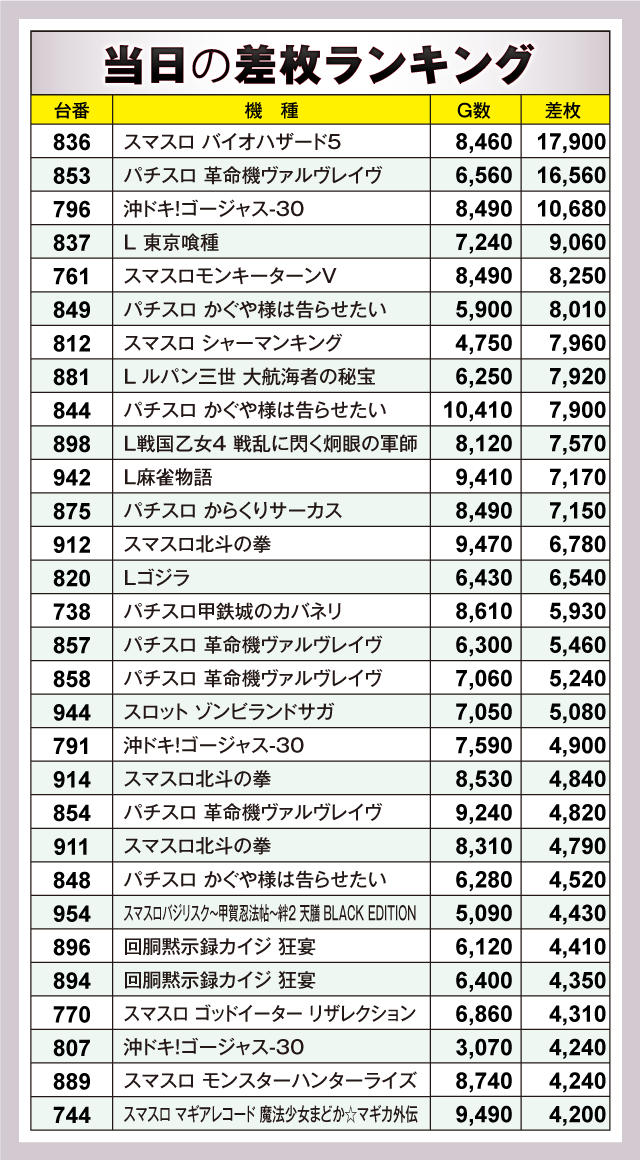 この日、最もプレイヤーの注目を集めたのが『スマスロ バイオハザード5』で、怒涛の+17,900枚が飛び出し堂々のランキングトップに。さらに、『パチスロ 革命機ヴァルヴレイヴ』が+16,560枚、『沖ドキ!ゴージャス-30』が+10,680枚を記録しており、ランキングベスト3が実にハイレベルな結果を残しファンを喜ばせていた。