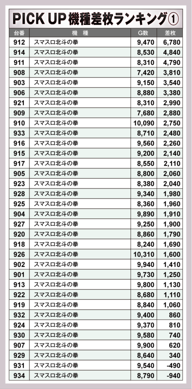 今回のPICK UP機種は全10機種。特に目立っていたのが『スマスロ北斗の拳』で、912番台の+6,780枚を筆頭にハイスコアが大量発生している。しかも、最終的に全34台中32台がプラス差枚となっており、ファンにとって充実の一日となったのは間違いないだろう。