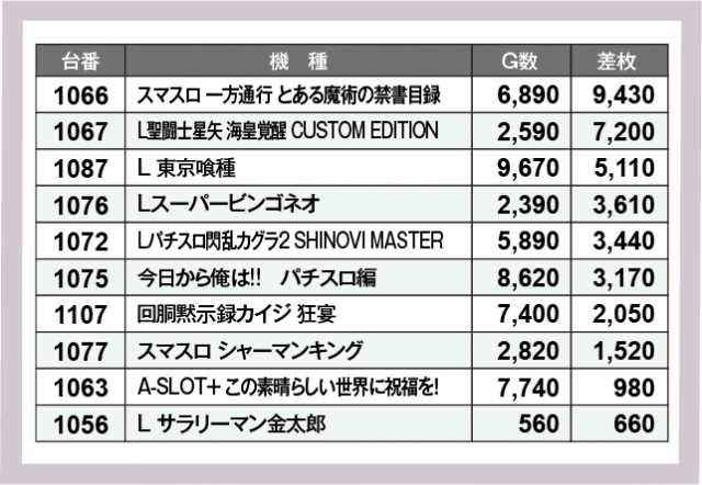 ※差枚数順に掲載しています